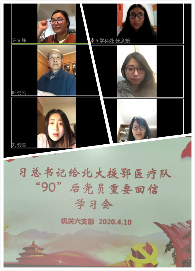 4月10日,机关六支部全体教职工开展了关于《习近平总书记给北大援鄂医疗队“90”后党员重要回信》的视频学习会。会上,戴丽娟同志分享了习近平总书记的回信内容及关于青年工作的重要论述,与会同志就学习内容、学校实际、自身工作等进行了交流讨论。
