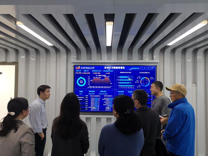 随后,王总工结合数据集成工具和数据采集工具对统一数据治理平台、数据开放平台和数据分析平台的建设效果进行展示,并邀请参会人员实地观察已经投入使用的“在线学习数据可视化”“学生结构大屏”“师资结构大屏”三块可视化大屏,其中教学教务平台的登录人数、课程点击数、教师批改作业时长、学生作业分数段占比、在籍本专科专业人数等模块数据引起了热烈的讨论。张新海科长向参会人员分享了三块可视化大屏的建设历程,并对新版教学教务平台移动端的功能进行演示。