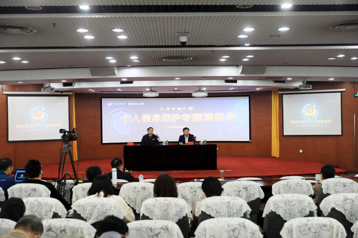 为深入学习贯彻习近平总书记关于网络强国的重要思想和关于教育的重要论述,把握当前网络安全工作面临的新形势,了解网络安全法律法规和政策文件要求,进一步提升学校网络安全与信息化工作水平,提升网络安全保障能力,推进新时代教育信息化发展,11月10日下午,我校信息化建设处在定淮门校区综合楼2楼第二报告厅开展了个人信息保护专题培训,此次培训采用线上直播和线下相结合方式,特邀南京市公安局网络安全保卫支队大队长缪林警官为讲师,耿焕同副校长主持会议,学校各职能部门及学院科级及以上干部约200余人现场参与培训,学校及全省办学系统教职工组成300余个学习小组,约1300余人在线同步参与学习。