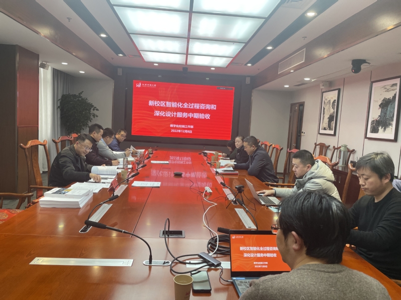 2022年12月8日下午,数字化校园工作部在定淮门校区综合楼15楼会议室组织召开江苏开放大学新校区智能化全过程咨询和深化设计服务项目中期联合验收会。本次会议由信息化建设处王小军总工程师主持,邀请南京航天航空大学信息化处处长张焱、南京农业大学信息化建设中心主任查贵庭、河海大学网络安全与信息化办公室主任张伟建、南信息工程大学信息化建设与管理处处长杜景林以及我校新校区管委会办公室主任李剑、基建处处长王卫和后勤处处长陈翀组成专家组进行评审指导,招投标办公室代表周蕾、项目承建方代表一同参会。