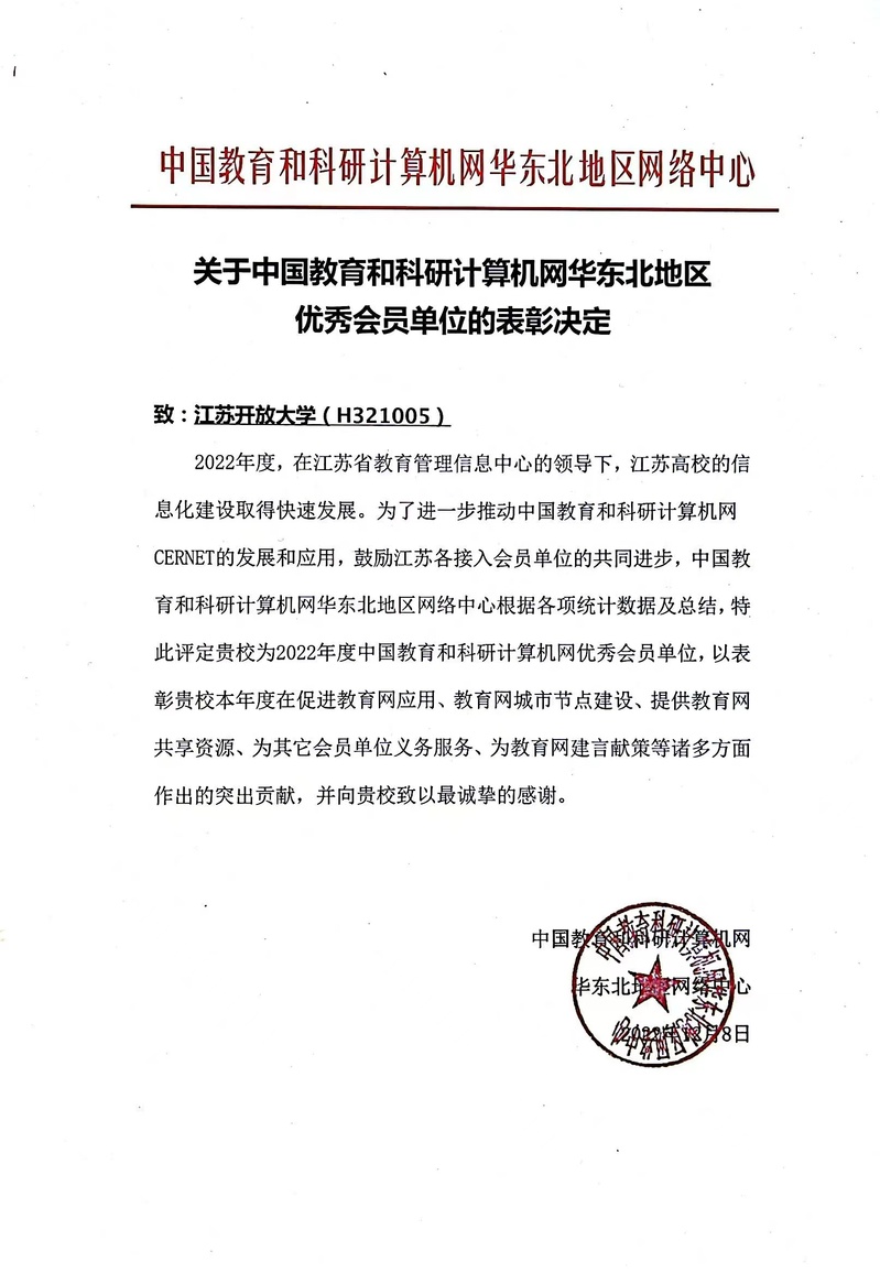 日前,我校被中国教育和科研计算机网(CERNET)评为“中国教育和科研计算机网2022年度优秀会员单位”。